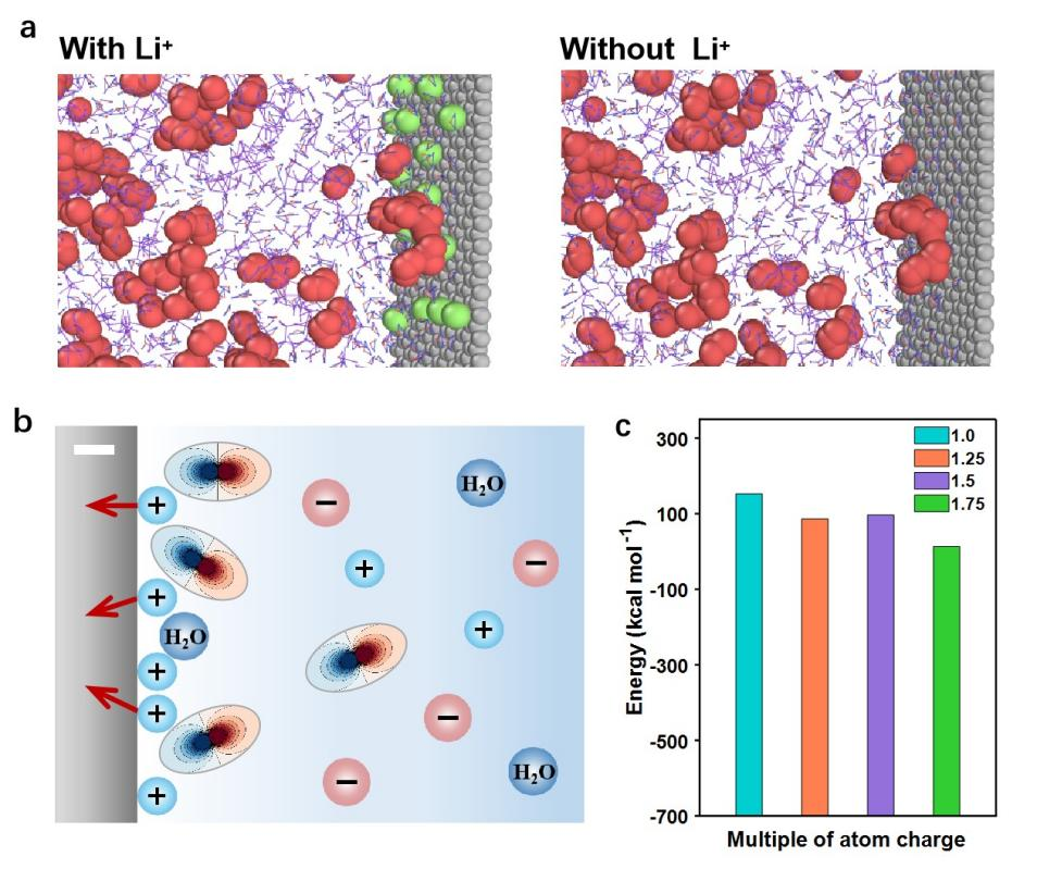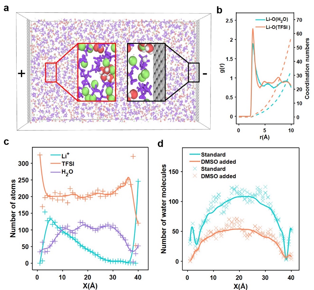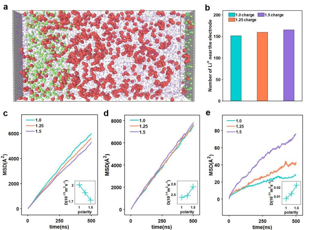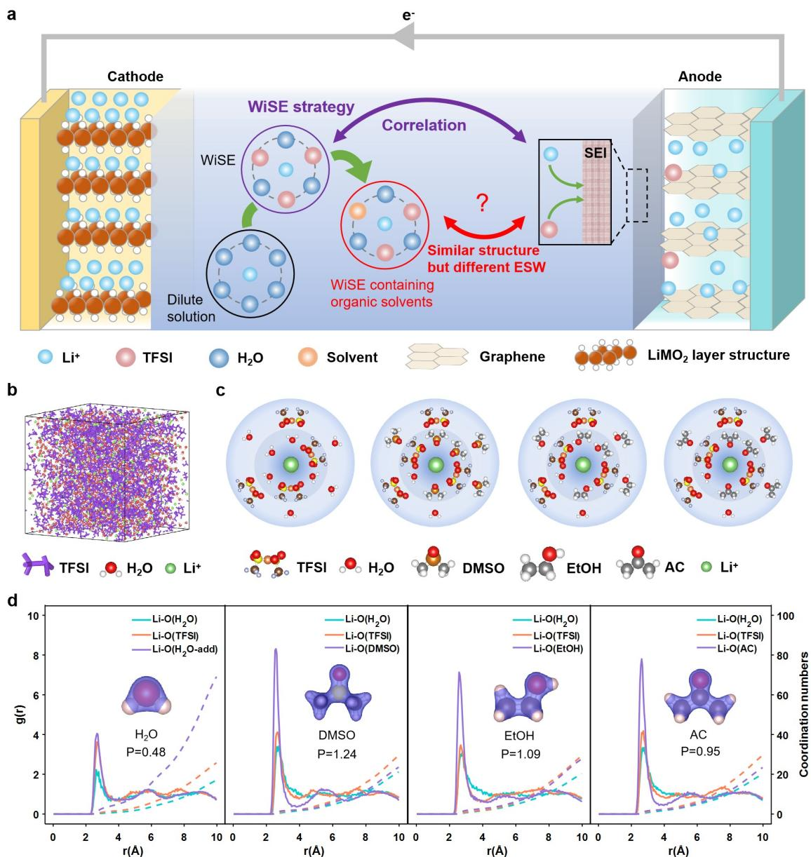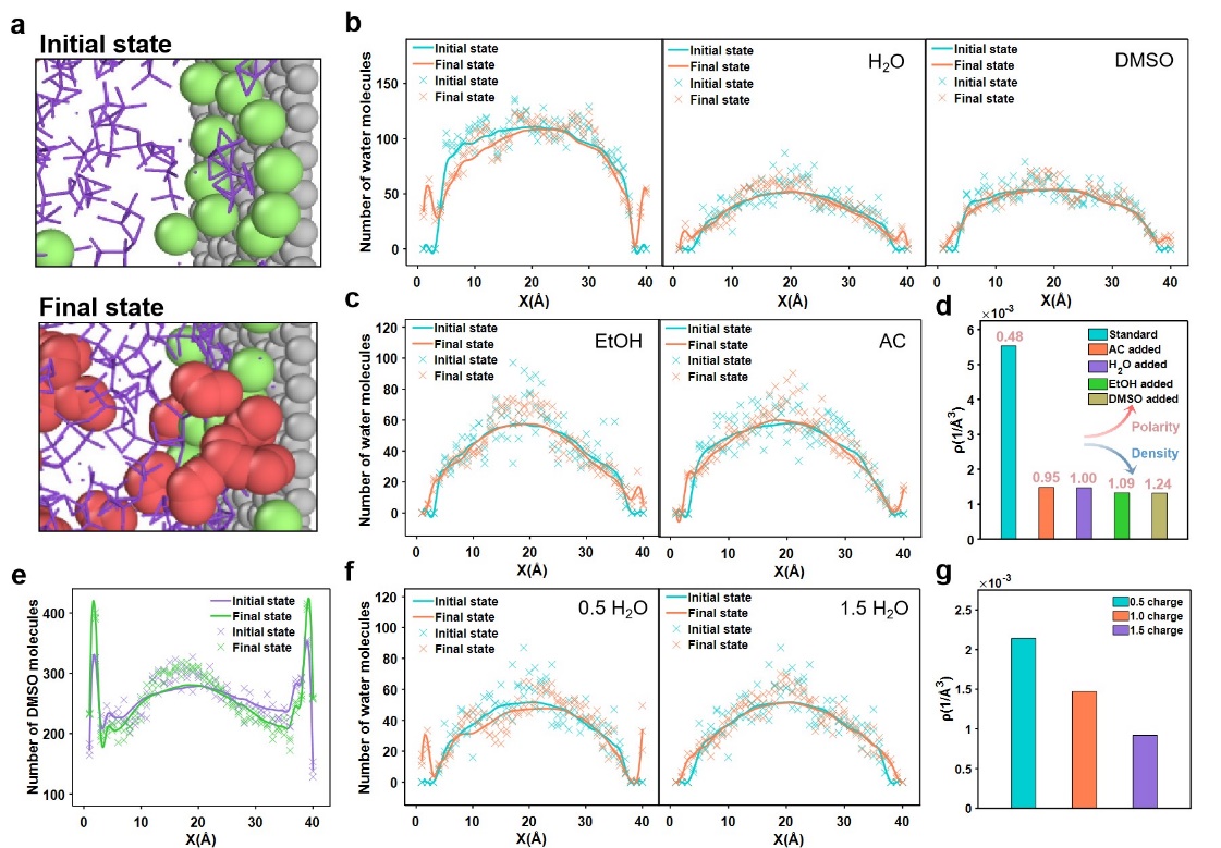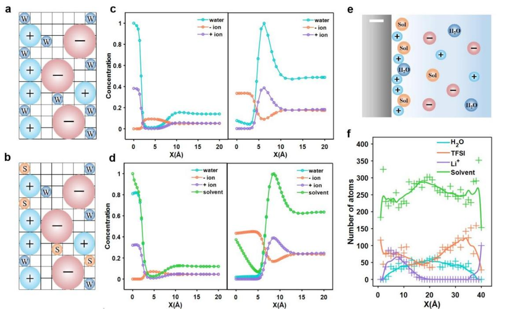 过去十年间,盐包水电解质在该领域取得了突破性进展。然而,一个亟待解决的问题是能否通过新方法进一步拓宽ESW。针对这一问题,团队深入研究了电解质的独特动力学特性,检查了它们在形成电双层(EDL)期间和之后的动力学行为。提出了用于估计电化学稳定窗口的指标。该指标不仅补充而且通过融入先前被忽视的关键动态方面,增强了对电化学稳定窗口的理解。通过分子动力学模拟,发现了极性溶剂的极性对离子和水分布的显著影响。具体而言,在界面处,高极性溶剂因其极性取向能够巧妙地与电场对齐,从而降低能量,因此备受青睐。因此,观察到极性较弱的水分子被这些高极性溶剂分子(电双层的主要成分)排斥。这一观察很好地解释了实验中通过添加少量极性溶剂而导致的电化学稳定窗口的显著变化。根据模拟,增强溶剂极性不仅拓宽了电化学稳定窗口,还在系统内建立了高效的传输通道,促进了离子插入和传输,从而提高了电化学器件的整体性能。