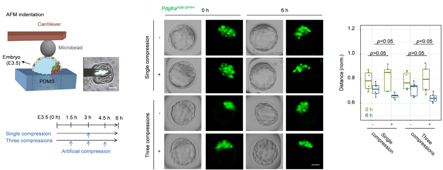图1.通过AFM操控囊胚腔振荡的力学实验技术,发现强化或抑制腔振荡会相应的加速或延迟EPI和PrE两种细胞的空间分离