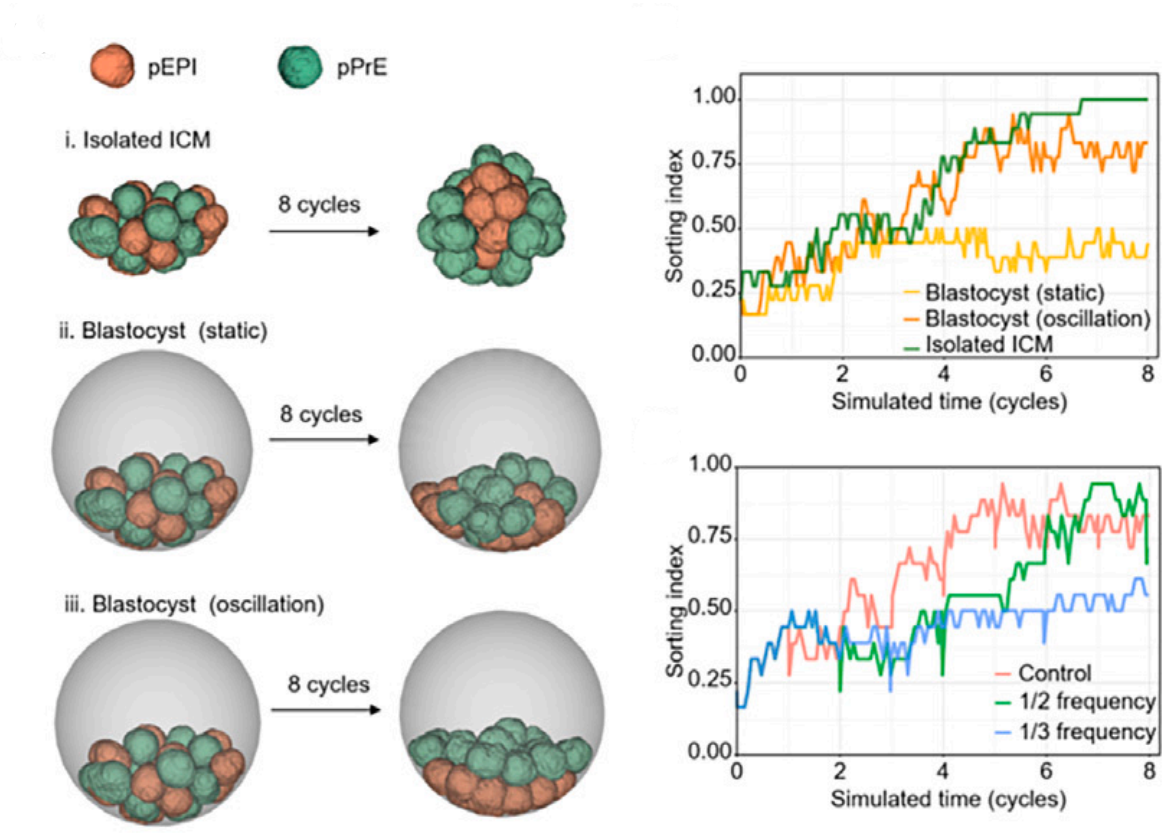 图2. 数值模拟显示囊胚腔的物理振荡促进了ICM细胞间的接触波动和汇聚流动