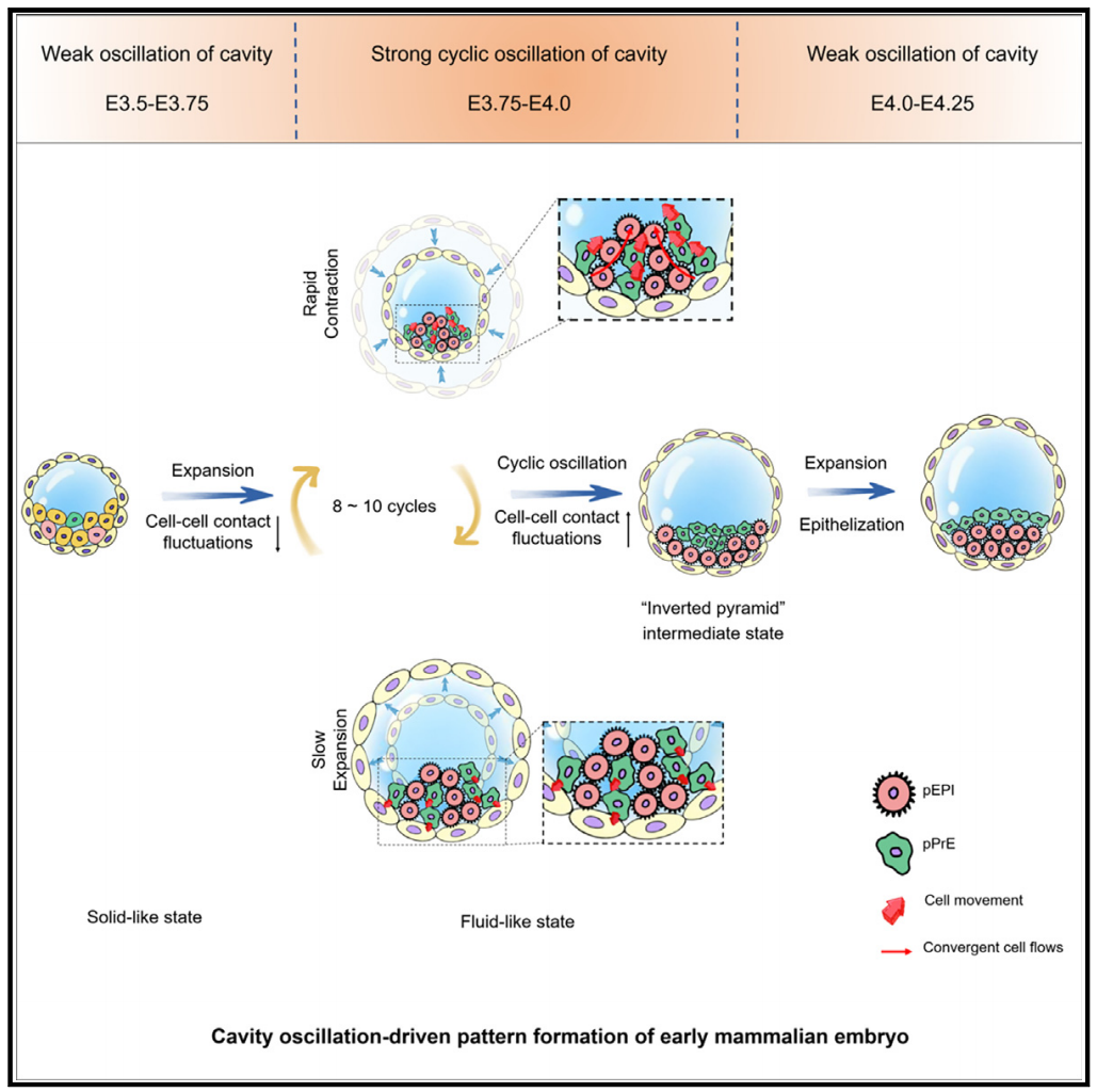 在哺乳动物胚胎早期发育中,细胞命运决定是关乎胚胎发育调控机制及组织/器官模式形成的重要课题。其中,在第一次细胞命运决定(即滋养外胚层TE与内细胞团ICM分化)完成后,会发生第二次细胞命运决定,即囊胚腔内细胞团ICM中的上皮细胞(EPI)和原始内胚层细胞(PrE)发生进一步细胞分化和空间分隔的过程。该过程对后续组织/器官形成有重要影响,但其形成及调控机制是长期困扰学界的难题。近日,北京航空航天大学、中国科学院力学研究所、中国科学院动物研究所、北京化工大学、清华大学等联合团队研究了力学振荡机制在第二次细胞命运决定中的重要作用,揭示了囊胚腔的周期性振荡驱动其中上皮细胞(EPI)和原始内胚层细胞(PrE)空间分隔的机理及力学调控机制。该成果以“Cavity oscillation drives pattern formation in early mammalian embryos”为题发表于Cell Reports (2025, 44, 115342)。