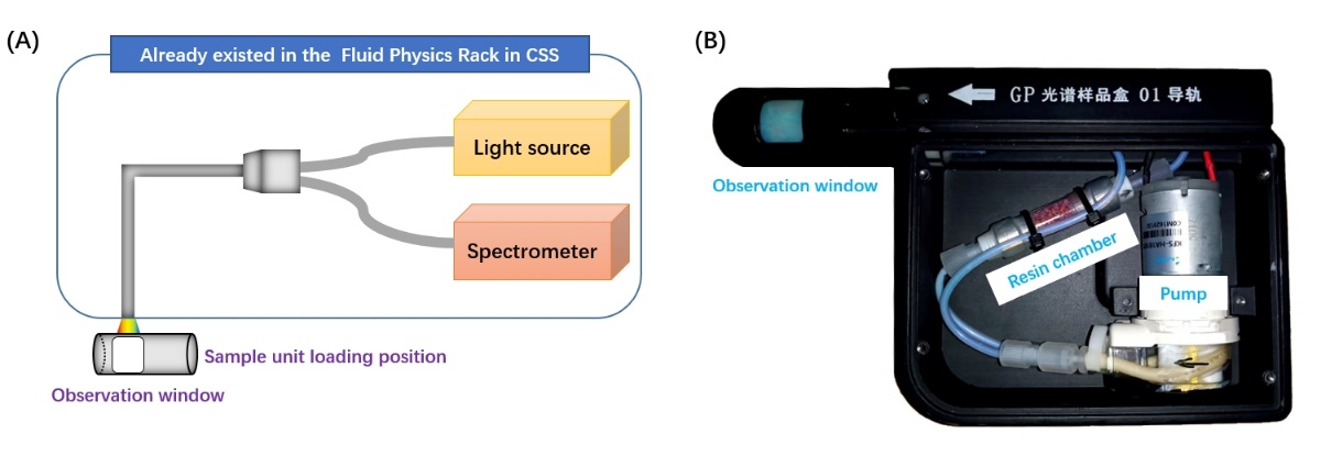 图1 (A) 空间站流体物理柜的反射光谱示意图;(B) 结晶样品单元照片