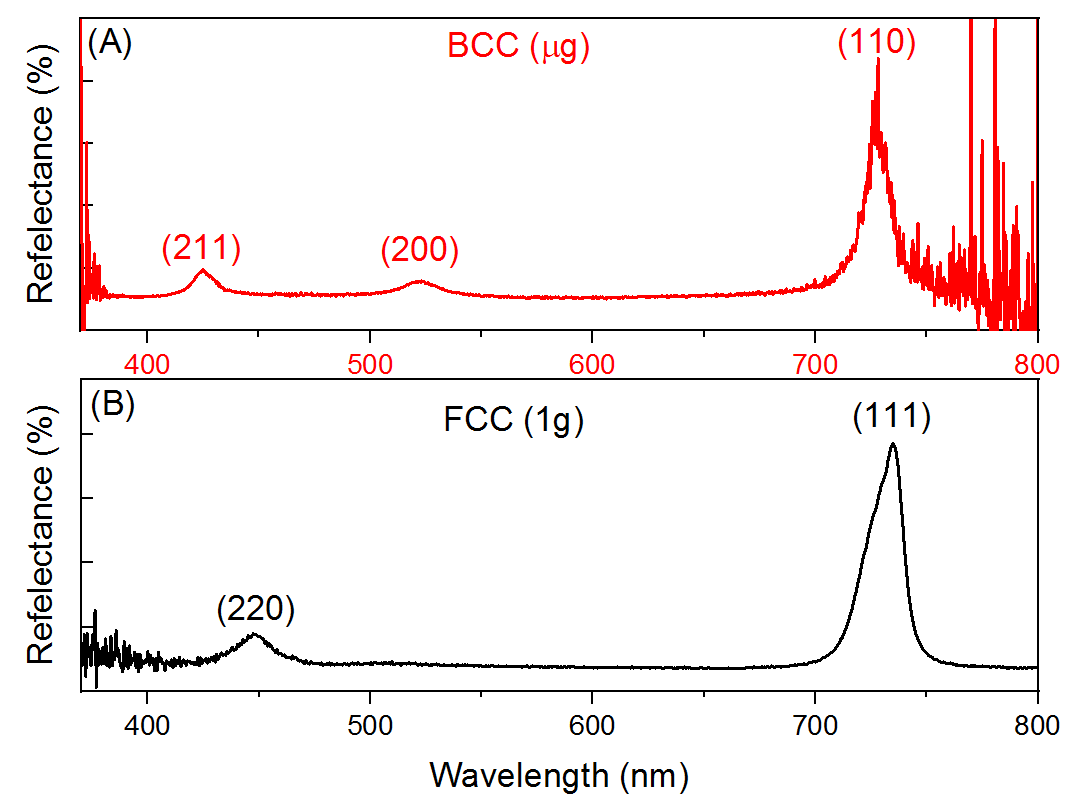 图2空间(A)和地面(B)胶体结晶的反射光谱图。晶体结构分别为亚稳态bcc和稳态fcc