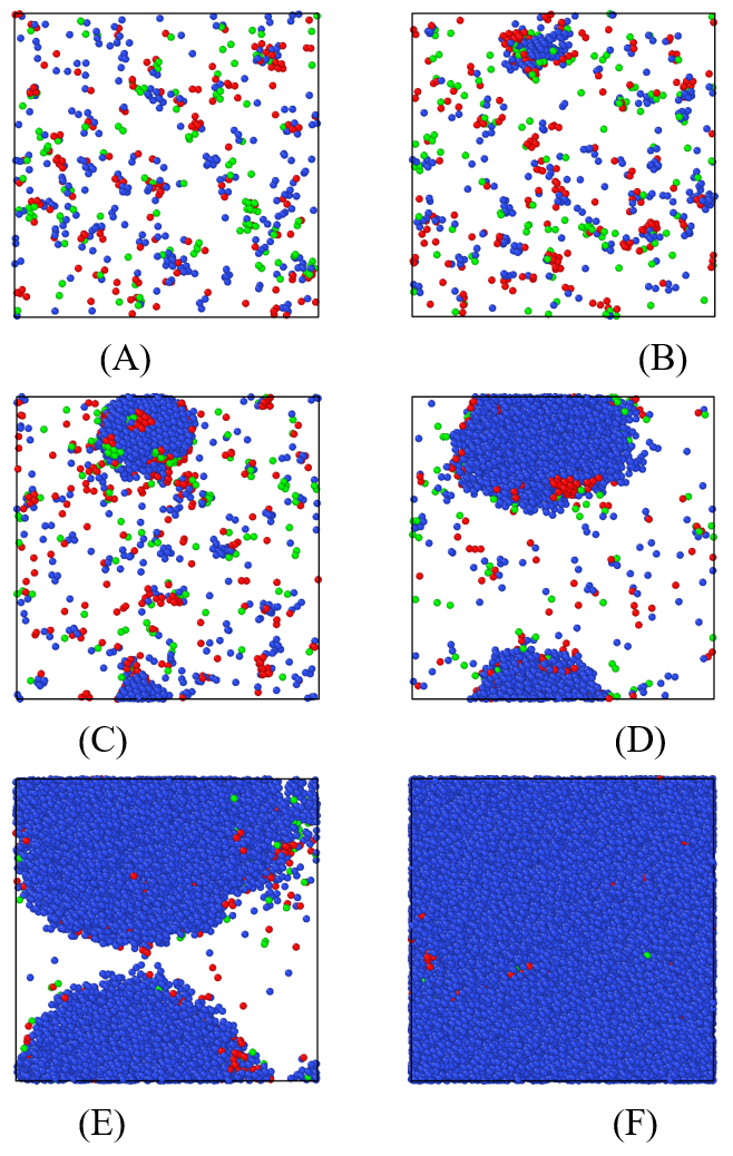 图3分子动力学模拟中,带电胶体在不同时刻的构型。其中红色球代表fcc,蓝色球代表bcc,绿色球代表密排六方(hcp)