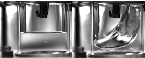 图2 落舱释放前(常重力)的液氧界面(左)和回收阶段的液氧界面(右)