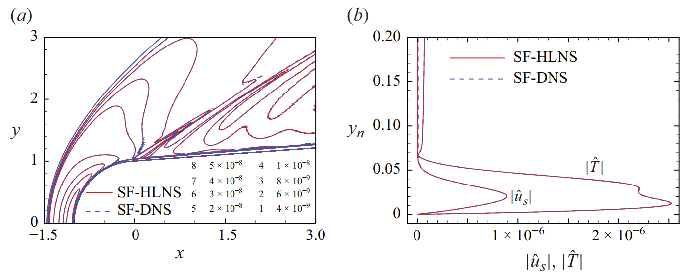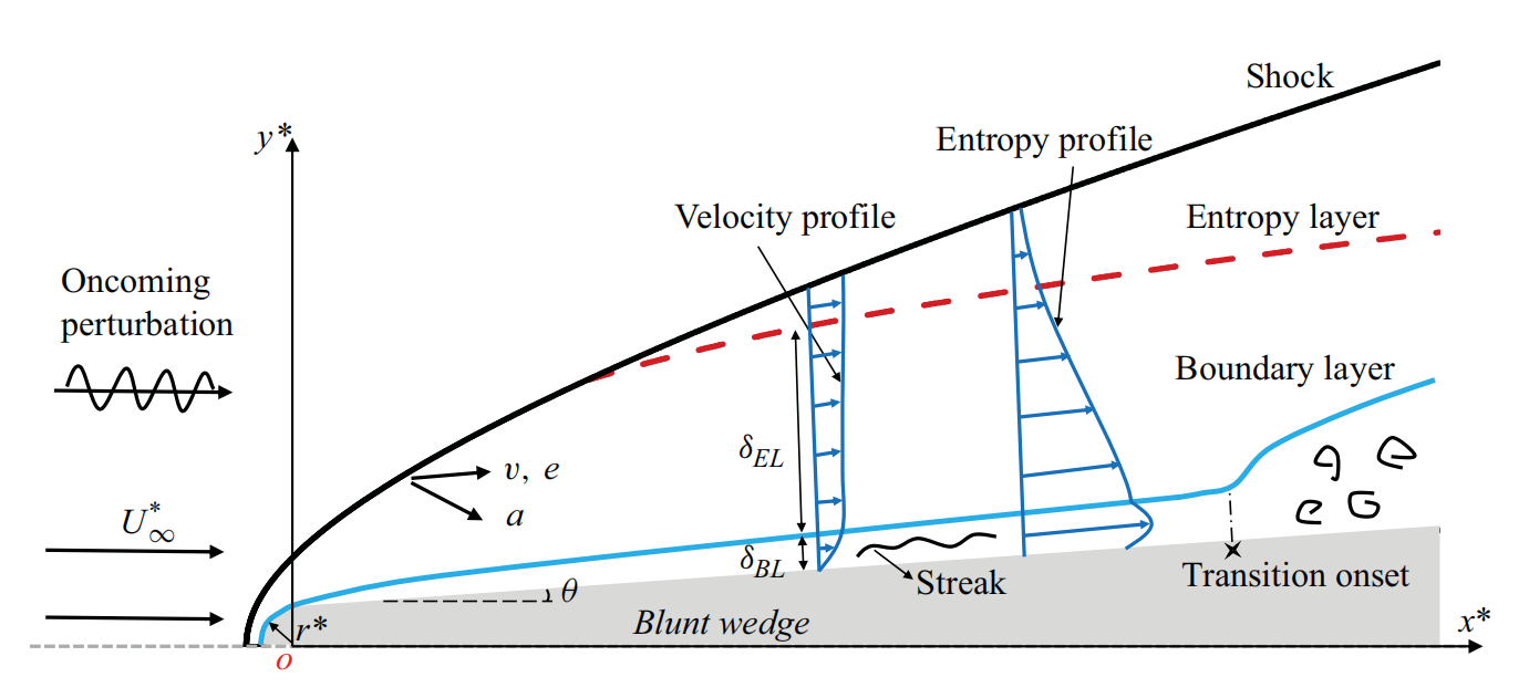 高速边界层转捩往往使飞行器表面的摩擦阻力和热流突增数倍,因此准确预测转捩的位置对于评估飞行器的气动性能至关重要。为降低高超飞行器头部所承受的高热流,常采用钝化前缘设计,这会引发脱体弓形激波和熵层的出现,从而显著抑制边界层中的模态失稳机制及其主导的自然转捩过程,使得非模态扰动主导的旁路(bypass)转捩过程成为触发湍流的主导机制。因而,有效刻画高超边界层中非模态扰动被来流扰动激发的感受性过程尤为关键。近日,天津大学和力学所的研究团队合作,在高超声速钝体边界层的非模态感受性机理及预测方法方面取得突破。该工作以“Excitation of non-modal perturbations in hypersonic boundary layers by free stream forcing: shock-fitting harmonic linearised Navier–Stokes approach”为题,发表在Journal of Fluid Mechanics杂志上。