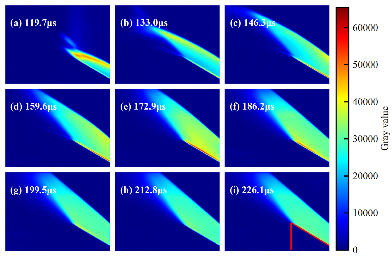图1 楔形模型的膨胀区辐射高动态成像实验结果(激波速度3.37 km/s,气流方向由右至左)