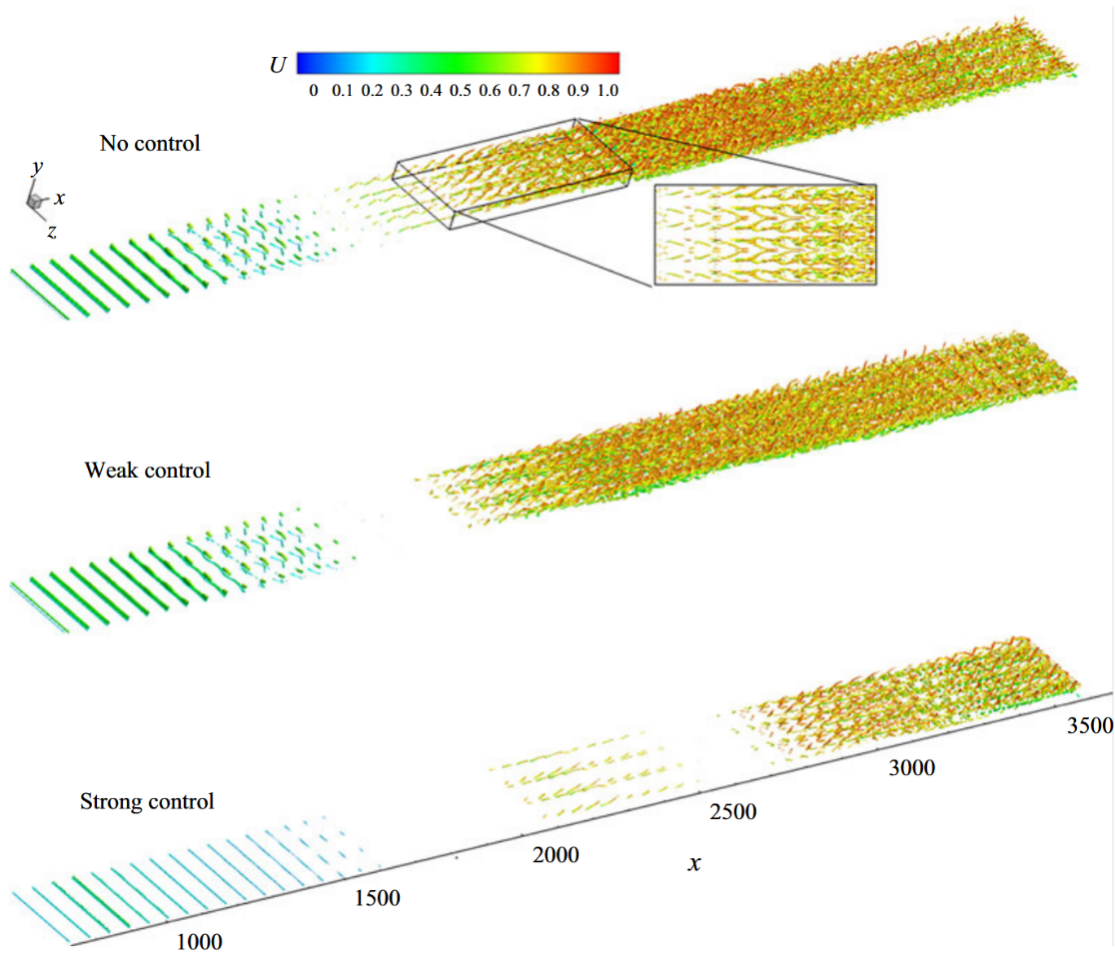 边界层转捩是高速飞行器气动性能设计的关键瓶颈问题。在转捩过程中,飞行器表面的摩擦阻力和热流常会骤增数倍,因此,有效推迟转捩对于优化飞行器气动性能与热防护设计至关重要。对于环境扰动较弱的高空飞行工况,边界层转捩由Mack模态扰动的放大触发,其过程涵盖感受性、线性失稳及非线性共振等阶段。传统转捩控制方案主要聚焦于抑制失稳模态的线性增长率,但此类方案通常仅在特定频带内有效,而在其他频带可能产生不利影响。近期,力学研究所与天津大学合作研究团队提出了一种针对扰动非线性演化阶段的调控新思路,旨在实现宽参数范围内的转捩延迟。该研究在利用壁面温度控制手段调控高超声速边界层基频共振效应及其物理机理方面取得突破性进展。相关成果以“Control of hypersonic boundary layer transition by suppressing fundamental resonance using surface heating”为题,发表于流体力学领域顶级期刊 Journal of Fluid Mechanics。