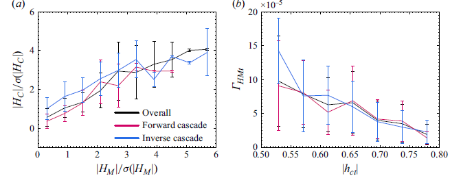 图3 太阳风数据验证。左:Hall效应引发交叉螺旋度;右:交叉螺旋度减弱级串效率