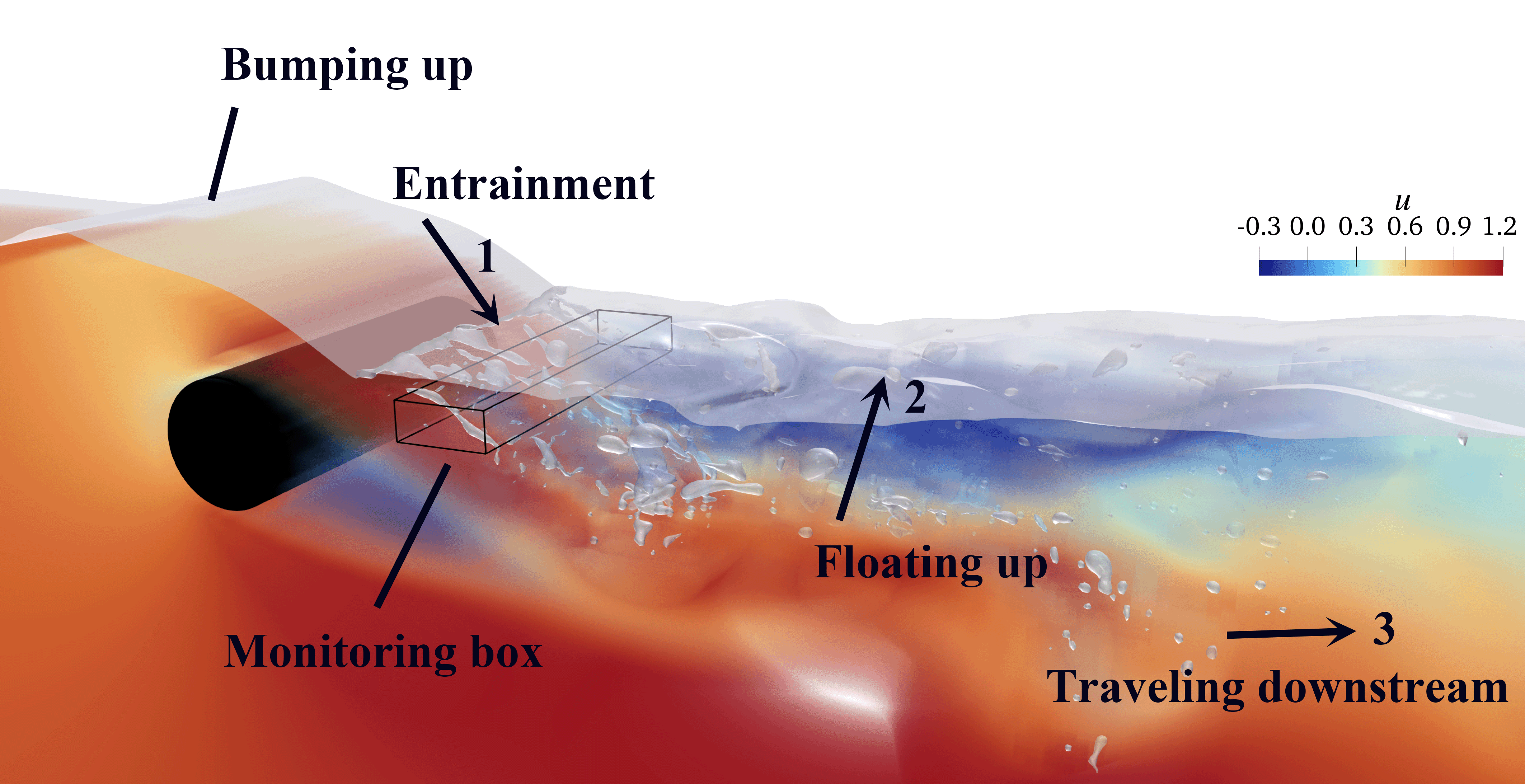 绕流尾迹与自由液面的相互作用是海洋工程中的关键问题,涉及水下航行体、海洋结构物等多类应用场景。该问题在理论、实验和数值模拟方面存在挑战。特别是在液面大变形条件下,流动存在液面剧烈破碎、翻卷和空气卷入等复杂现象,形成大范围混相湍流,其内在机理仍有待深入揭示。