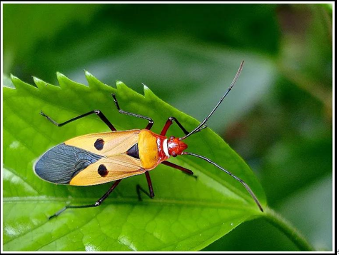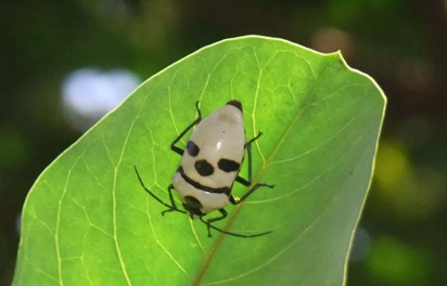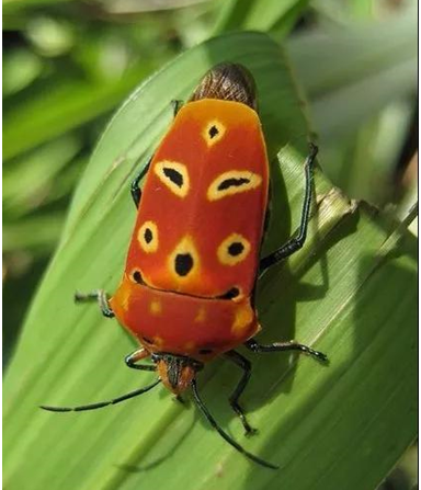 5、大金盾蝽盾背上有三枚黑色斑点,就好像是鼻子和眼睛,前胸后缘的黑色横带,就好像咧开的大嘴巴