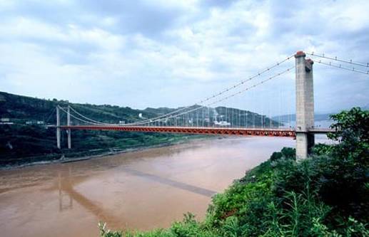 它位于重庆忠县,是一座单跨加劲桁架梁悬索桥。它是长江上唯一的通体红色的大桥,主桥560米,引桥639.73米,于2001年9月竣工通车。