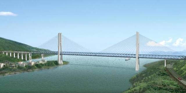 它位于重庆涪陵区,是渝利铁路的重要控制性工程,它是当时世界上最大跨度的双线铁路斜拉桥。主桥长1137.5米,主跨432米,采用双塔双索面钢桁梁斜拉桥结构,于2011年6月26日正式合龙,于2013年与铁路一起通车。