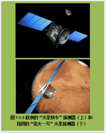 如要将探测器送往火星,由于路途遥远,通常要采用霍曼转移轨道的方法,如图7-1-2中所示。首先我们要将探测器发射到较低的绕地圆形轨道,然后第一次变轨,使探测器进入一个偏心率较大的绕地椭圆轨道,这个轨道和火星的绕日轨道相切,当探测器飞行到这一相切点时,火星也应该运行至此,此时再一次变轨,使探测器进入到火星的绕日轨道,这时探测器已经比较接近火星了,接下来我们还需要再一次变轨,使探测器进入绕火星运行的轨道,最后,就是要使探测器安全降落到火星的表面。当然,要使探测器安全着陆也不是件容易的事情,许多探测器就是在这一过程中失败的。在这里我们只能对这一过程介绍一个大概情况,由于地球的绕日轨道平面和火星的绕日轨道平面并不重合,而且发射窗口的时间有限,所以火星探测器的发射和控制比上述所描述的还要复杂得多。