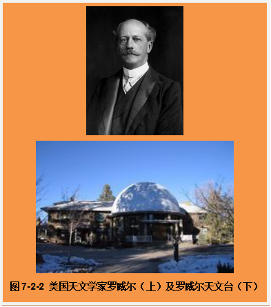 帕西瓦尔·罗威尔也是一位对火星研究充满热情的美国天文学家。罗威尔的家境富裕,凭着家里优异的经济条件,他在美国亚利桑那州的弗拉格斯塔夫市自费建造了一座天文观测站,专门用于对火星的研究。经过数十年的观察,他宣称已经发现了近200条运河,并推测,这些运河的开凿是为了将火星两极的冰水输送到其它的地区,是为了满足某些干旱地区火星人的用水需求。罗威尔还绘制了大量有关火星表面运河的图片。1895年,罗威尔出版了一本关于火星上运河的专著。晚年的罗威尔,将他的兴趣转向了有关寻找海王星外第九颗行星的研究。虽然他生前未能如愿,但他去世后,罗威尔天文台继续从事这项研究工作,并于1930年真的找到了冥王星。冥王星(Pluto)的名称中所含有的PL字母,是他名字的缩写,这也是发现者以此来寄托对罗威尔的深切缅怀。罗威尔于1916年11月16日逝世。