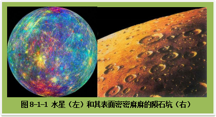 水星是离太阳最近的一颗行星。由于它紧挨着光芒四射的太阳,在地球上观察它很不容易。通常我们只能在日出或日落时才能短暂地看到它。我国古代,人们称它为“晨星”或“昏星”。它的体积不大,比月球大不了多少。水星和我们的地球一样,也是一颗固体星球。它的表面布满了大大小小的陨石坑,这说明在水星几十亿年的历史长河中,曾经遭到过无数陨石的撞击,可以说它是历经磨难、遍体鳞伤。水星的直径为4878千米,自转周期为58.6个地球日,所以水星上的一天大约相当于我们地球上的三个月。而它的公转周期仅为87.9天,比我们地球上的一年要短得多。水星离太阳很近,它在白天的表面温度可以高达摄氏400多度。由于水星上的大气层非常稀薄,所以一到晚上,气温就会骤降到零下150度。水星有一个微弱的磁场。