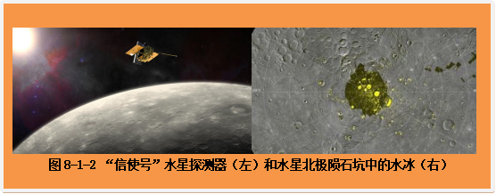 尽管水星白天的表面温度可以高达摄氏400度以上,但在水星两极的陨石坑中,由于有一些地方终年照不到阳光,这些地区的温度可能会降至摄氏零下200度。“信使号”在探测过程中,发现水星北极的陨石坑中有大面积的水冰,估计较薄的冰层也有一米多厚,有些地方可能厚达数十米。