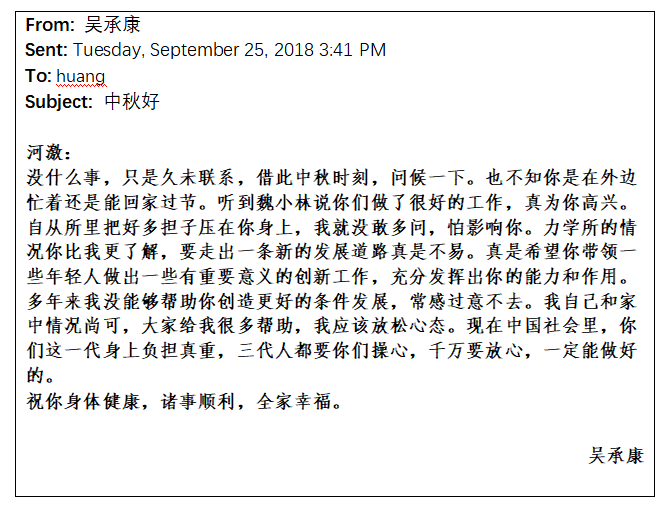 由于个人性格内向,我对吴先生虽然满心尊敬、充满感激,但其实是疏于问候的。然而,先生却是实实在在地惦记着我,让我至今感念。2015年,吴先生提醒我在繁忙工作之余要主动放松身心,并推荐我听Susan Reed的歌,说这是他和黄老师年轻时回国在船上听的,当时他们很喜欢这位年轻的女歌手。2018年,我们在外场实验,中秋节的时候突然收到了吴先生的邮件,让我再次感受到先生的殷殷惦念。