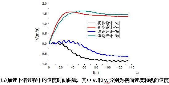 从图6中结果的比较可以看出,运动数学模型给出的最终稳定的运动速度、俯仰角和达到稳定所需时间与CFD给出的结果很接近,下潜稳定速度的相对误差小于15%。这表明该研究团队提出的数学模型能够较好地模拟潜器加速下潜的过程。更重要的是,它可以提高潜水器非定常潜浮过程运动模拟的计算速度。相对于CFD仿真需要5天时间计算一个工况(120核并行),而该数学模型在半分钟内就能给出结果,大大提高了计算效率,并可以满足工程设计需求,从而有效支撑了工程设计。
