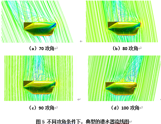 从上述仿真结果可以发现,潜水器在下潜过程中俯仰运动的振荡较大,这是为什么呢?研究团队通过仿真分析,给出了答案。因为潜水器的下潜过程类似于钝体绕流,就是说,它是以其“底部”作为运动的前沿向海水的深部移动。图5给出了在不同攻角下,潜水器周围的流线结构图。可以看到,在潜水器背部存在较大的涡结构。由于背部涡结构随时间的演化,导致了潜水器在运动过程中所受的俯仰力矩无法达到稳定,从而引起潜器下潜过程中的俯仰角振荡。