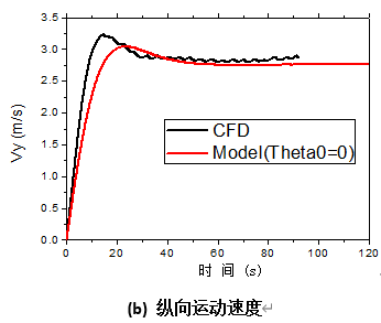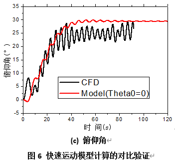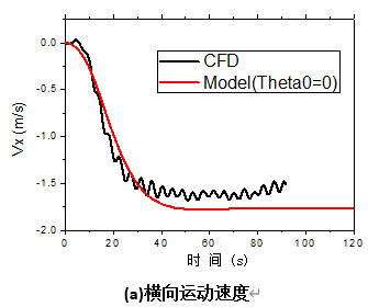 图6给出了求解上述数学模型所得到的加速下潜过程中,潜水器的下潜速度、横向运动速度和俯仰角变化。研究团队还利用典型工况下潜浮运动CFD数值模拟结果,对所建立的简化数学模型进行了校核,图6中示出了两种计算结果的对比。