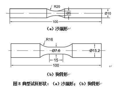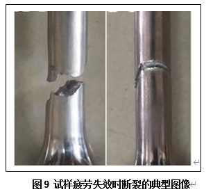 力学所研究团队对于用于耐压舱的钛合金(Ti62A和TC4ELI)开展了大量的疲劳实验。怎样进行实验呢?当然不能用整个耐压舱做疲劳试验,这样时间和资金成本都非常巨大,一般是采用力学中常规的试样测试方法。换言之,这里是用钛合金做成试样,然后在试验机上施加循环载荷,记录它发生断裂时的循环次数,观察试样断口形貌,研究疲劳寿命随各种影响因素变化的规律。图8给出的是两种典型试样的形状,研究人员根据需要选用不同形状、尺寸的试样进行疲劳实验。图9则给出疲劳失效断裂的典型图像。