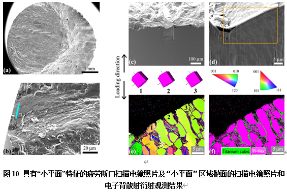 为了探讨耐压舱用钛合金的疲劳裂纹萌生机制,力学所研究团队利用扫描电镜对疲劳断口进行了观测。实验结果揭示了耐压舱用钛合金呈现两种不同的裂纹萌生机制,其中一种是由α晶粒解理导致的,在此情况中疲劳断口裂纹萌生区域具有“小平面”特征。图10给出了在最大应力σmax=693 MPa, 应力比R= –1, 疲劳寿命Nf =3.27×105情况下,具有“小平面”特征的疲劳断口扫描电镜图像及“小平面”区域抛面的扫描电镜照片和电子背散射衍射观测结果。其中,图(a)为整个试样断口表面扫描电镜照片;图(b)为断口裂纹萌生区域扫描电镜照片;图(c)和(d)为“小平面”区域(即图(b)中蓝线所标识的位置)沿主应力方向抛面的扫描电镜照片;图(e)和图(f)为“小平面”区域(即图(d)中方框内的区域)的电子背散射衍射观测结果(紫色区为密排六方α相,绿色区为体心立方β相)。