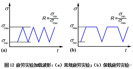 力学所研究团队进一步考虑了海试工作环境下耐压舱的“保载”疲劳问题。大家知道,潜水器是一个要多次完成各项海底作业的装置。每次作业都要经历下潜、作业、上浮三个阶段。在下潜阶段,耐压舱所受的海水压力(载荷)是逐渐增加的;在海底作业阶段,耐压舱所受的海水压力(载荷)基本保持稳定不变,可称之为“保载”;而在上浮阶段,耐压舱所受的海水压力(载荷)则是逐渐减小的。潜水器在全寿命中的每次作业都要重复这个过程,力学家就把它承受的变化载荷近似用一个周而复始的曲线或折线(例如梯形波)来表示,进而研究材料在这种交变载荷作用下的力学性能,并称之为“保载疲劳”特性。“保载疲劳寿命”便是指保载疲劳失效时材料或构件所经受的应力或应变的循环次数。图12示出了一种常规疲劳(Conventional fatigue)实验波形和一种保载疲劳(Dwell fatigue)实验波形,其中σ为单位面积上承受的作用力(即应力),R为最小应力和最大应力之比(即应力比)。