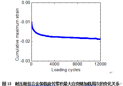 图13是力学所研究团队给出耐压舱钛合金在模拟海水环境下最大压缩应力保载时累积最大应变(Cumulative maximum strain)和加载周次(Loading cycles)之间的关系。可以得知:在最大压缩应力保载情况下,随着加载周次的增加,累积最大应变会增大。这样就可以为工程师的结构设计提供必要的基础实验数据和科学依据。