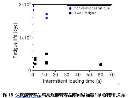 另外,潜水器服役寿命内,耐压舱结构会承受不连续的升载(下潜)-保载(作业)-卸载(上浮)作用。这种不连续加载或间歇加载时间(Intermittent loading time)对耐压舱的保载疲劳行为有没有影响?这对于耐压舱结构的寿命评估也十分重要。图15给出了耐压舱用钛合金在这方面的研究结果,并与相应的常规疲劳(Conventional fatigue)寿命进行了比较。可以看出:间歇加载时间总体上对钛合金的保载疲劳(Dwell fatigue)寿命没有影响,但是它会降低钛合金的常规疲劳寿命。然而,需要指出的是,不管是间歇加载还是连续加载,保载都显著降低钛合金的疲劳寿命。
