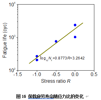 力学所研究团队还考察了应力比(Stress ratio)对保载疲劳寿命的影响。图16给出的结果表明:在最大应力相同的情况下,保载疲劳寿命随着应力比的增加而增加。图中的线条为实验点的线性回归结果,揭示了保载疲劳寿命的对数值和应力比呈近似线性关系。