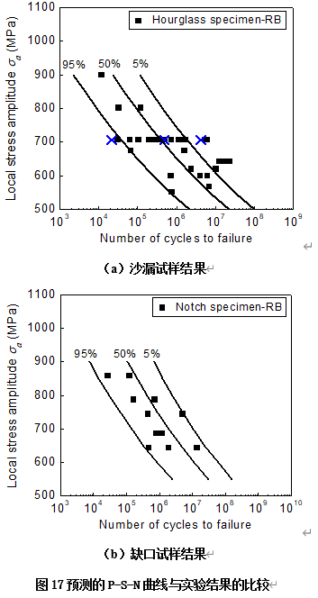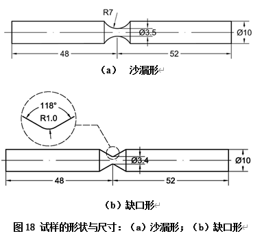 从上面的说明中,大家可以体会到材料的疲劳研究是相当繁复的任务,要进行大量的试验,每次试验要反复加载千百次甚至几千万次,而且数据点还比较分散。不仅如此,不同尺寸、不同加载方式下材料的疲劳性能往往也会有较大的差异。力学所研究团队针对不同几何形状试样(沙漏形和缺口形),分别采用两种不同加载方式(常规轴向加载和旋转弯曲加载),开展了耐压舱钛合金的疲劳寿命实验测试,并基于材料疲劳破坏机理和微结构统计分布特征发展了一种概率控制体积方法来预报试样尺度、缺口和加载方式对材料疲劳性能的影响。图17示出了理论模型和试验数据的比较。图中的线条为对旋转弯曲加载下沙漏形试样(Hourglass specimen)和缺口试样(Notch specimen)预测的P-S-N曲线,符号“×”为旋转弯曲加载下沙漏形试样在应力幅σa=706.2 MPa下17个实验数据点统计分析得到的5%、50%和95%存活率的疲劳寿命。可以看到,理论预报与实验结果相符。而图18则给出实验中所采用的两种试样的形状与尺寸。