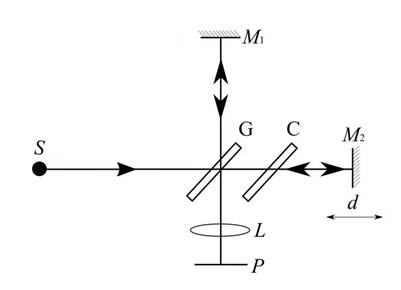 不难想到,如果能在空间探测引力波,应当可以获得更多频段的引力波信号。因为不同频率的引力波对应于不同的天体物理过程,例如地面装置观测到的高频(>10赫兹) 引力波主要是对应于致密双星的引力辐射。由于受到空间距离的限制和地球重力梯度噪声的影响,基于地面的引力波探测实验装置无法探测低于10赫兹的引力波,所以它的研究目标就变得较为有限。现在,空间激光干涉法测量中、低频引力波已成为天文学和空间宇宙物理领域的最前沿课题。到目前为止,无论是在地面,还是在太空,利用激光干涉仪测量引力波都是一个重要的途径。它其实就是迈克尔逊激光干涉仪,其工作原理如图2所示,说明如下。从光源S处发出的一束入射光,在分束板G被分为两束,透射光经过补偿镜C后被平面镜M2反射回来,反射光被平面镜M1反射回来,两束光经透镜L聚焦后在光检测器P处能够发生干涉,两束光的光程差不同时形成的干涉图样是不同的。当M2的位置发生d值的改变时,通过干涉中两束光的干涉图样可以测得对应的光程差(即d值)。