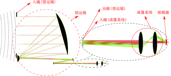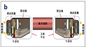 图6a给出探测星组的工作运行示意。在实际的探测过程中,干涉臂两端测试质量间的距离变化分为三个部分进行测量:第一部分是测量卫星一与其内部测试质量之间的距离变化;第二部分是测量卫星二与其内部测试质量间的距离变化;第三部分是测量卫星一和卫星二之间的距离变化。第一、二部分的测量是利用各自内部搭建的测试质量干涉仪来测量的,第三部分的测量则是利用星间激光干涉链路进行测量的。其实,理想情况下,在无拖曳技术的控制下,卫星与其内部的测试质量之间的相对位置一般不会发生变化,但是由于一些残余的噪声影响,卫星与其内部测试质量的相对位置会发生变化,因此需要搭建干涉仪进行测量。从本质上讲,这三部分测量都是利用迈克尔逊激光干涉原理的,只不过系统结构不太一样。例如,为了测量卫星一与卫星二之间的距离变化,远端的光束经过本地望远镜缩束后,打到本地光学平台,再与本地的光束进行干涉(下文将对此做具体的说明)。这就是图6b中所示的望远镜的用途。
