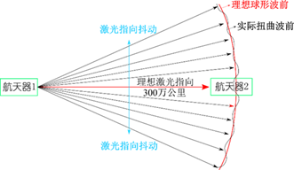 下面就来简要谈谈光程误差是怎么回事儿吧!望远镜在接收由远端卫星发出的光束同时,还会发射本地的激光器发出的光束并经过百万公里的自由传输到达远端卫星。即便如此长的星间激光干涉链路,距离变化测量的精度要求依然极其苛刻,总的测量位移精度需在皮米(pm)量级。而在空间环境中,不免总要受到太阳风等非保守力的扰动,卫星姿态不可避免地发生抖动。这种抖动会引起望远镜在接收或者发射光束时,光束的传输方向发生抖动。当接受光束与本地光束进行干涉测距时,两干涉光束之间的波前不匹配耦合抖动会引起额外的光程噪声,如图7b所示。同时发射光束经过望远镜扩束并进行远场传输时,由于望远镜残余像差的影响,会形成光束的波前畸变。光束的波前畸变耦合两个卫星之间的指向抖动也会引起额外的光程噪声,如图8所示。人们将上述两种噪声统称为星间激光链路中的抖动光程耦合噪声。