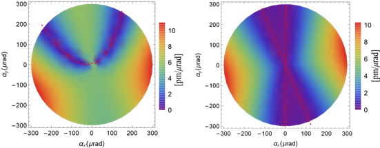 针对于上述问题,力学所引力波实验中心团队与长春光机所太极团队从干涉机理出发,分析了影响空间干涉测距系统精度的抖动光程耦合噪声。他们通过编写的泽尼克多项式算法拟合光束波前形状(参见图9),建立了完备的抖动光程耦合噪声的物理模型。他们利用蒙特卡洛算法全面分析了波前差对抖动光程耦合噪声影响(参见图10),结果表明:要满足测距精度要求,两干涉光束间的波前差需优于λ/30(λ是波长)。他们还提出了一种利用干涉光束与探测器间的横向偏移减小抖动光程耦合噪声的新方法:图11(左)为没有采用横向偏移的情况,图11(右)是采用了横向偏移的情况,采用横向偏移后的效果很明显。此外,研究团队还利用光束的远场传输模型,分析了像差耦合指向抖动对测量精度的影响。相关工作对全链路空间激光干涉测距系统的搭建具有重要的指导意义,并得到了国际同行的关注。