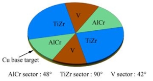 下面具体说明一下这项研究时如何开展的。他们采用这台自主研制的气相沉积(PVD)设备,以Ar(氩)和N2(氮)构成真空室的环境,以铝铬(AlCr),钛锆(TiZr)和钒(V)构成拼接靶材(参见图7),利用高能脉冲磁控溅射(HiPIMS)装置将靶材中的5种主元素溅射出来在样品表面上形成(AlCrTiVZr)N薄膜,实验中的基体材料则是碳化钨(WC)硬质合金刀具。该设备还同时配有直流磁控溅射(DCMS)装置,在研究中采用直流磁控溅射形成的(AlCrTiVZr)N薄膜作为比较的参照系。