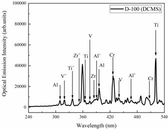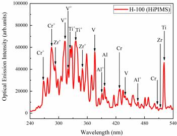 高能脉冲磁控溅射构建了一个高离化率的高熵合金等离子体成膜环境。在脉冲期间,磁控溅射装置输出的能量非常高,产生的等离子体环境的电子密度可高达1019m-3。此数值比直流磁控溅射的相应值要高好几个数量级。不仅电子密度高,电子能量也很高,靶材原子将获得巨大的输入能量从而离化成离子,从而可以产生很强的离子轰击效应,使得所制备的薄膜十分光滑且无孔隙。该实验研究获得的等离子体发射光谱显示:HiPIMS等离子体中所有靶材元素均呈现强烈的离化态趋势,而在DCMS等离子体中靶材元素则基本以激发态的形式存在(参见图8)。