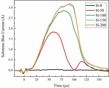 为了控制离子轰击作用,HiPIMS制备薄膜过程中还辅以基体偏压技术。所谓的基体偏压技术就是在镀膜的过程中对样品加载负偏压,这时在基体表面会形成一个电压降很高,厚度仅为毫米级的区域,它有个学术名称“等离子体鞘层”。通过改变偏压的大小,可以调控等离子体鞘层的电势差,从而实现对达到基体表面的等离子体能量和通量的控制。研究结果表明离子能量和通量的增加,可显著增强离子轰击效应。图9示出了5种不同偏置电压下(H=0,-50V,-100V,-150V,-200V),基体偏压电流随时间的变化曲线。
