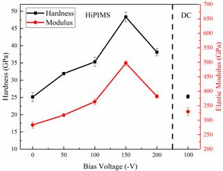 这项研究通过调控离子轰击效应,改变离子达到样品表面的能量和通量,达到了促进择优形核点的产生、提高沉积粒子的迁移率和和刻蚀效应的目的。实验研究结果表明,在强离子轰击效应作用下,薄膜的微结构形貌玻璃态化,晶粒尺寸细化(平均粒径最小可达11.3nm),表面粗糙度改善(低至0.4nm)。相关结果分别示于图10-12中。此外,HiPIMS制备薄膜的硬度(Hardness)和弹性模量(Elastic Modulus)也有所提高(参见图13).