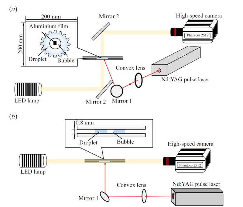 这项实验是在两个平板的间隙中进行的(参见图2)。平板之间有一个二维的柱形水滴(water droplet);利用固体脉冲激光器(YAG pulse laser)的照射在水滴内形成一个空泡(cavitation bubble),在下壁面上贴有一个方形铝膜作为激光的聚焦点;高速相机(high-speed camera)则可以记录空泡发展以及水滴界面演化的过程。实验结果表明:由于空泡发展经历膨胀(expansion)和收缩(contraction)两个阶段,水滴的演化会出现溅射(splashing)、通气(ventilating)和稳定(stable state)三个相态;当水滴表面的扰动(perturbation)达到空泡边界时,水滴的自由面便出现不稳定性状。