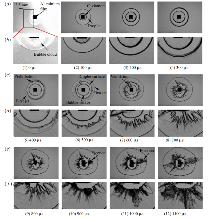 由于篇幅限制,这里只展示水滴初始直径为12毫米的实验结果(参见图3)。它是高速相机给出的水滴与空泡演化过程的图像,时间的零点是激光触发点火时刻。图3(a)示出在零时刻(t=0微秒)激光聚焦在铝膜上并导致空泡的形成。在随后的时间里,水滴伴随着空泡的膨胀而长大。空泡的尺寸大约在t=330微秒时达到最大,然后进入收缩阶段。此时,从图像中还可以发现,在水滴界面处出现了环形射流,被称为第一射流(first jet)。而且,实验图像还表明,随着空泡的收缩水滴表面的扰动显著增大。特别是,他们发现:在t=600微秒时,水滴表面的扰动已经贯穿了空泡的边界,在空泡内部和环境空气之间形成了一个通路,环境空气可以流入空泡。这便是所谓的“通气”现象。这个通气现象是学者第一次在实验中观察捕获到的。在t=800微秒左右时,空泡开始溃灭,它会产生一个压力脉冲,使得水滴表面的运动方向逆转。但是,在本实验中水滴不会逆转,因为这里的水滴和空泡都被上下两块板限制了。空泡发生通气现象,可以形成准稳定/稳定的流态,也就是空泡不发生振荡和溃灭。这样,就在很大程度减小了水动力载荷的生成,因此可以实现良好减阻和增稳的效果。