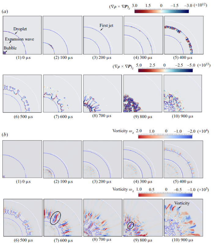 对于实验揭示的界面不稳定和通气现象,冲击与耦合效应课题组还开展了数值分析研究,图4给出了水滴初始直径为12毫米的模拟计算结果,包括斜压(baroclinicity)和涡量(vorticity)ω在z 方向上分量随时间的演化情况(分别参见图4(a)和图4(b)。和图3的实验结果比较,可以看到,数值计算和实验图像相符很好。