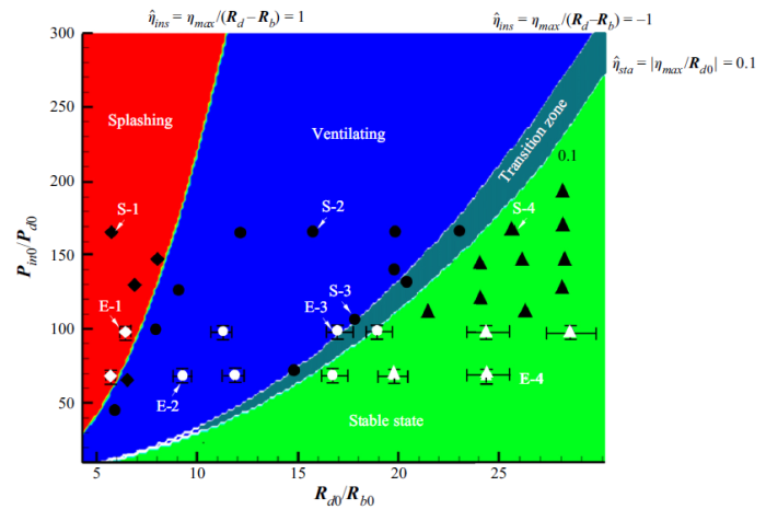 其中 R 是半径,P 是压强,下角标 d 指液滴、b 指空泡、in 是指空泡内部、0 表示初始时刻。而每个相域内的符号则是本研究取得的结果:白色为实验结果,黑色为数值结果。这个相图,可以帮助人们找到空泡/自由面稳定流态的区间。这也是航行体的适航区间。