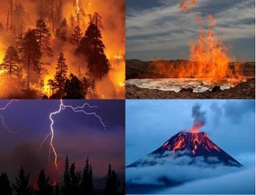 自然界中存在充足的氧气和各类可燃物质(如植被、化石燃料等),在一定能量的点火源(如闪电、火山喷发的热岩浆等)的作用下,可形成各种形式的自然火(也称野火)。自然界中的野火与当地的生态环境、生物种群相互作用,形成一定的生态平衡。