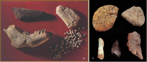 图2 北京猿人遗址出土的(a)烧骨、碳化种子以及(b)烧石(图片来源:网络)