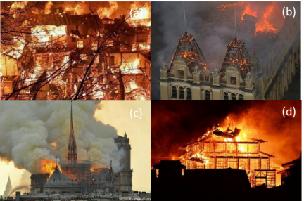 图6 古建筑火灾实例:(a)2014年云南香格里拉古城火灾;(b)2015年巴西博物馆火灾;(c)2019年法国巴黎圣母院火灾;(d)2019年日本首里城火灾。(图片来源:网络)