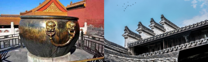 图7 古建筑中传统消防措施:(左)故宫铜质水缸;(右)徽派民居马头墙(图片来源:网络)