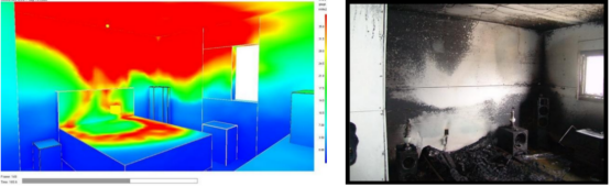 图9中展示了一个房间过火后的数值模拟结果和实物场景照片。通过对火灾过程的重构,再结合现场火灾痕迹的勘测,人们便可以调查火灾事故的起火位置和原因。