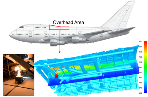 图11 波音747顶棚火灾的模拟研究:(左)实验安排;(右)数值计算结果(DOT/FAA/TC-21/8)