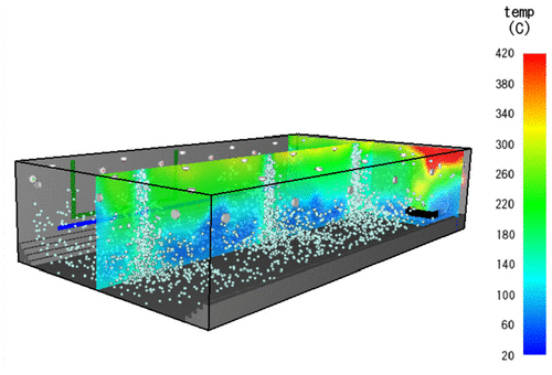 飞机在空中发生火灾难以像地面火灾那样进行施救, 所以事先对可能发生的火灾进行模拟十分重要。如图11所示, 美国联邦航空管理局 (FAA)对波音747飞机客舱顶棚结构中火灾场景进行了全尺寸模拟(包括了实验安排和数值计算),给出了明火导致的顶棚温度分布情况。这样便可以评估其火灾风险。而图12示出的是飞机货舱中氮气灭火系统的模拟结果,它动态复现了氮气(白色圆点)与火焰的相互作用,这项研究的目的是评估货舱灭火系统的性能。